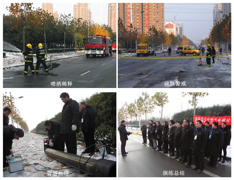 15時10分,消防隊到達現(xiàn)場,開展噴灑作業(yè)稀釋燃氣濃度、疏散人群封鎖道路;15時15分,公司搶險隊到達現(xiàn)場,與消防隊配合關(guān)閉上下游控制閥門、滅火、檢測現(xiàn)場燃氣濃度并向附近小區(qū)張貼停氣通知;15時30分,搶修隊開始對DE250中壓管道搶修,刮口、固定、焊接;15時45分,搶修完畢;開啟控制閥門、查漏、置換、恢復(fù)供氣、打掃現(xiàn)場;16時,演練圓滿完成。