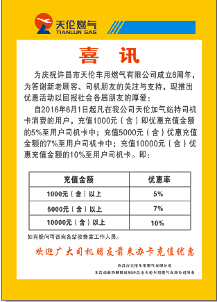 在自2016年6月1日起,凡持有我公司加氣站司機(jī)卡的用戶,充值1000元(含)即可享受充值金額5%的優(yōu)惠;充值5000元(含)即可享受充值金額7%的優(yōu)惠;充值10000元(含)即可享受充值金額10%的優(yōu)惠。各項(xiàng)優(yōu)惠金額直接返至您的司機(jī)卡中,即充即返,無(wú)需等候。