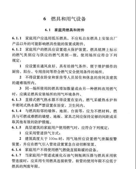 為規(guī)范家用燃?xì)馊紵骶?簡(jiǎn)稱燃具)的安裝和驗(yàn)收,保證燃具安裝工程的質(zhì)量和用氣安全,制定本規(guī)程。本規(guī)程適用于住宅中燃?xì)庠罹?、熱水器、采暖熱水爐等燃具及其附屬設(shè)施的安裝和驗(yàn)收。安裝的燃具應(yīng)符合國(guó)家現(xiàn)行有關(guān)產(chǎn)品標(biāo)準(zhǔn)的規(guī)定,且應(yīng)有產(chǎn)品合格證、安裝使用說明書和生產(chǎn)許可證。燃具應(yīng)由經(jīng)考核合格的人員安裝。燃具安裝及質(zhì)量驗(yàn)收除應(yīng)執(zhí)行本規(guī)程外,尚應(yīng)符合國(guó)家現(xiàn)行有關(guān)標(biāo)準(zhǔn)的規(guī)定。